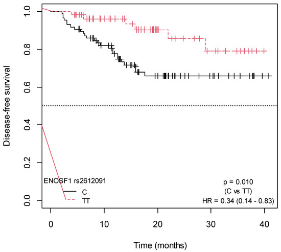 A significant association was found between the ENOSF1 rs2612091-TT genotype and increased DFS (p = 0.010; HR = 0.34; 95% CI = 0.14–0.83, for C vs. TT, and p = 0.040; HR = 0.31; 95% CI = 0.10–0.90, for CC vs. TT) (Table S10). The Kaplan–Meier survival curves illustrating the associations of DFS with the ENOSF1 rs2612091 SNP are presented in Figure 5 and Figure 6. In the bivariate Cox model, an association was observed between the MTHFR rs1801131-T allele and decreased DFS, as all events occurred in patients carrying this allele (p = 0.040) (Table S10). No association was found between DFS and the remaining studied SNPs (Figures S6–S17; Table S10).