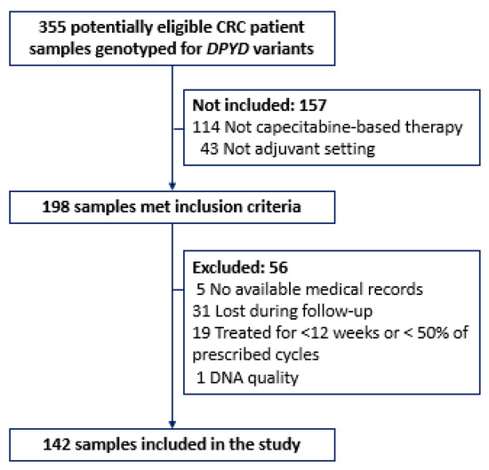 The DNA samples of CRC patients were included in the study when meeting eligibility criteria. The inclusion criteria encompassed patients with advanced CRC who were candidates for capecitabine-based adjuvant therapy, aged ≥18 years, and possessed a performance status ≤ 2. Patients with previous malignancies, without available medical records, missing data, lost during follow-up, with abnormal liver or renal function, treated for less than 12 weeks or less than half of the prescribed cycles, and DNA samples with low quality were excluded from the study. The number of CRC patients with DNA samples available during the study recruitment period and who met selection criteria determined the sample size. From 2019 to 2022, 355 CRC patients underwent genotyping for DPYD variants. Among them, 198 individuals met the inclusion criteria, while 56 were eliminated due to exclusion criteria, resulting in a final cohort of 142 patients included in the study (Figure 7).