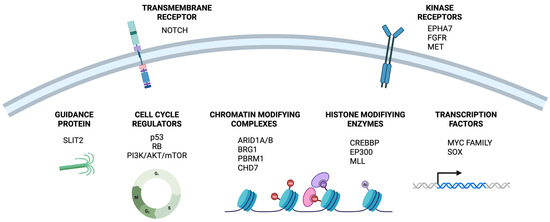 Among other common events in this type of cancer are mutations in genes that encode enzymes modifying histones, such as the histone acetyltransferases CREBBP (CREB Binding Protein) and EP300 (E1A Binding Protein P300), as well as the histone methyltransferases MLL (Mixed Lineage Leukemia). Genes encoding chromatin modifying complexes (e.g., BAF-SWI/SNF and PBAF-SWI/SNF complexes) have been identified as being frequently mutated in SCLC, including the ARID1A/B (AT-rich Interaction Domain 1A and 1B), BRG1 (or SMARCA4), PBRM1 (Polybromo-1), and CHD7 (Chromodomain Helicase DNA Binding Protein 7) genes [14]. SCLC tumors show recurrent somatic alterations in proteins related to cytoskeleton formation or cell–cell and cell–matrix interactions, such as SLIT2 (Slit Guidance Ligand 2) and mutagenic alterations in kinase receptors, like the inactivation of EPHA7 (EPH Receptor A7) and/or the amplification of FGFR (Fibroblast Growth Factor Receptor) and MET [15]. The PI3K (Phosphatidylinositol 3-kinase)/AKT/mTOR (Mammalian Target of Rapamycin) signaling pathway, linked to enhanced proliferation and migration of SCLC cells, is another frequently altered pathway, with activating mutations found in PIK3CA (Phosphatidylinositol-4,5-Bisphosphate 3-Kinase Catalytic Subunit Alpha), AKT, and PTEN (Phosphatase and Tensin Homolog) genes [16].