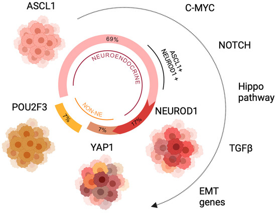 Recently, it has been demonstrated that these subpopulations can coexist within the same tumor as a result of lineage plasticity, with the ASCL1 subtype evolving into the NEUROD1 subtype and the latter into the YAP1 subtype [17,36], implying that these phenotypes are different phases within the same evolutionary process rather than distinct subtypes. This transformation from a neuroendocrine to a non-neuroendocrine state appears to be orchestrated by a set of critical genes and cellular programs such as the previously stated C-MYC (which activates Notch), Hippo, and TGFβ (Transforming Growth Factor β) signaling pathways as well as genes involved in the epithelial-to-mesenchymal transition (EMT) [17,26,37] (Figure 2). This continuum of plastic cell states illustrates the capacity of SCLC to trade off cancer hallmark-related tasks, enabling the cells to adapt to different microenvironments. This transforming capacity has been hypothesized to derive from the dysregulation of the innate plasticity of normal PNECs, which have been shown to differentiate in response to lung injury [38,39]. Other factors that may induce cell plasticity include tumor treatment and changes in microenvironment [38].