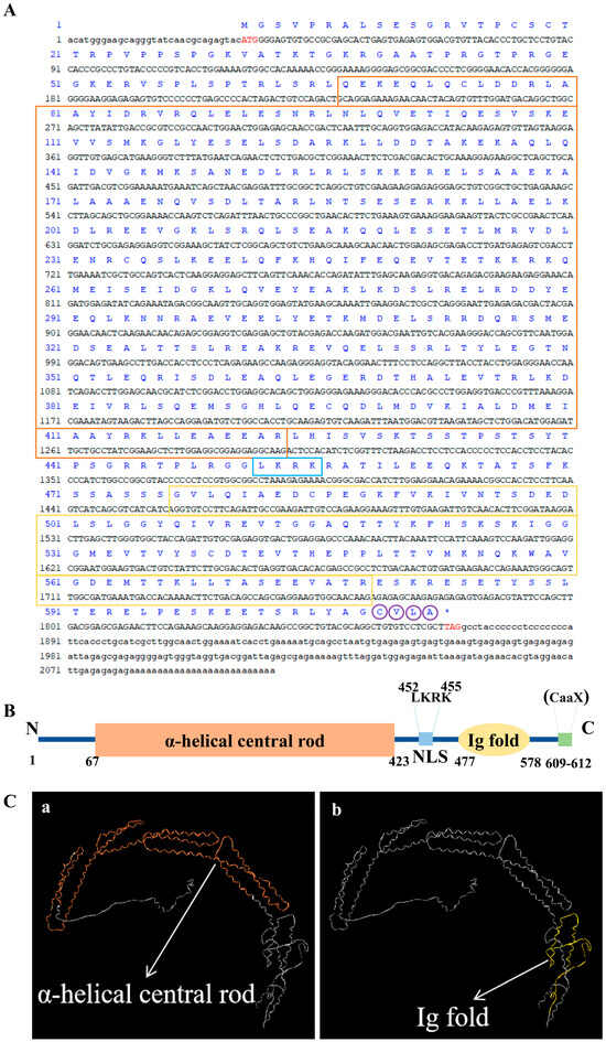 The full-length sequence of Pt-Lamin B gene and the secondary and tertiary structures of Pt-Lamin B protein. (A) The base sequence of the red font is the start and terminal codons. The sequence in the vermilion box is the α-helical central rod domain. The sequence in the yellow boxes is the Ig fold domain, the amino acid sequence in the blue box is the NLS, and the amino acid sequence in the purple circles is the CaaX motif unique to the IF protein family. “*” indicates a terminal codon. (B) The secondary structure of Pt-Lamin B protein. The orange region is the α-helical central rod domain (aa: 67–423), the yellow region is the Ig fold domain (aa: 477–578), and the blue region is the NLS (aa: 452–455). The C-terminal region had a CaaX motif unique to the IF protein family (aa: 609–612). (C) In the tertiary structure of Pt-Lamin B protein(a, b), the orange region of figure a is the α-helix central rod domain, and the yellow region of figure b is the Ig fold domain.