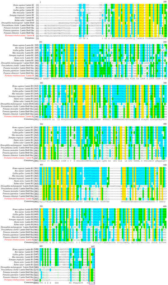 Multiple alignment of Pt-Lamin B with homologous sequences from vertebrate and invertebrate species. The same amino acids (aa) are indicated by yellow shading. The light blue shading indicates areas with 0.50% similarity and green shading represents areas with lower similarity. The red font is the amino acid sequence of the Lamin B protein of P. trituberculatus. The purple-boxed amino acid sequences are CaaX motifs unique to the IF protein family.