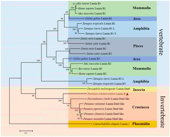 Phylogenetic tree analysis of Lamin B. Pt-Lamin B of P. trituberculatus shows the closest evolutionary relationship with Decapoda but a more distant evolutionary relationship with Lamin B vertebrates. The largest light blue part is for vertebrates, and the largest orange part is for invertebrates. The green regions are Mammalia. The dark blue regions are Aves and Amphibia. The light blue regions are Amphibia. The red region is Crustacea. The yellow regions are Insecta. The orange region is Phasmidia. The gray region is Pisces. The red triangle and red font are P. trituberculatus.