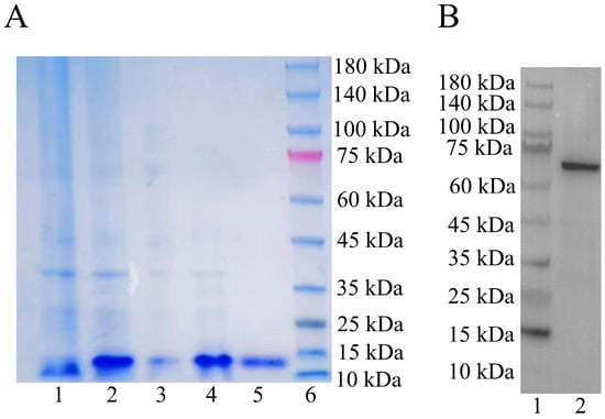 Expression of the Pt-Lamin B recombinant protein and rabbit anti-Pt-Lamin B antibody-specificity detection. (A) Expression of Pt-Lamin B recombinant protein. Line 1: uninduced bacterial liquid; Line 2: IPTG-induced bacterial fluid for 6 h; Line 3: supernatant of recombinant protein expression of Pt-Lamin B; Line 4: sediment of recombinant protein expression of Pt-Lamin B; Line 5: purified Pt-Lamin B recombinant protein; Line 6: maker. (B) Rabbit anti-Pt-Lamin B antibody. The results showed that the Pt-Lamin B bands were single and consistent with the predicted size of Pt-Lamin B (68.98 kDa). Line 1: Protein marker; Line 2: Pt-Lamin B protein band.