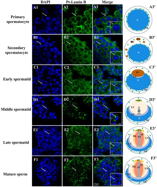 Distribution of Pt-Lamin B during spermatogenesis in P. trituberculatus. The blue signal represents the nucleus, the green signal represents Pt-Lamin B, and the white arrow points to the spermatid at different stages. The white dotted boxes represent enlarged images of spermatids pointed by white arrows. The white arrows in the dotted white box represent enlarged spermatids. In the pattern map (A3′,B3′,C3′,D3′,E3′,F3′), the green dots represent the signal distribution of Pt-Lamin B in spermatids at different stages of spermatogenesis. (A1–A3′) primary spermatocytes; (B1–B3′) secondary spermatocytes; and (C1–C3′) early spermatids, Lamin B was distributed in the nuclear membrane and in the cytoplasm. (D1–D3′) middle spermatids. (E1–E3′) Pt-Lamin B also had a strong signal in the acrosome complex in late spermatids. In (F1–F3′) mature sperm, Pt-Lamin B was still distributed in the perinuclear region and cytoplasm. However, the signal in the acrosome was weakened. The right column of (A3′,B3′,C3′,D3′,E3′,F3′) is a pattern map drawn based on the Pt-Lamin B position. N: nuclear; PG: proacrosomal granules; PV: proacrosomal vesicle; LC: layered complex; AC: acrosome cap; AT: acrosome tube; AF: acrosome fiber; ML: middle layer; LS: layered structure; NE: nuclear envelope. Scales = 10 μm.