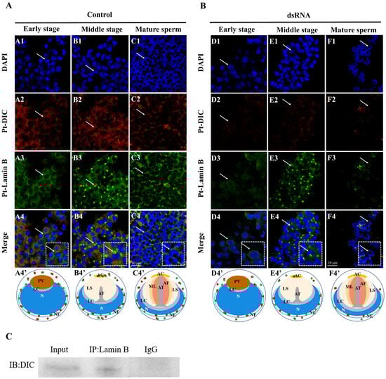 Expression distribution, co-localization, and immunoprecipitation of Pt-Lamin B and Pt-DIC during the spermatogenesis of P. trituberculatus after interference of the Pt-DIC gene. The white dotted boxes represent enlarged images of spermatids pointed by white arrows. The white arrows in the dotted white box represent enlarged spermatids. In the pattern map (A4′,B4′,C4′,D4′,E4′,F4′), the green dots represent the signal distribution of Pt-Lamin B in spermatids at different stages of spermiogenesis; The red dots represent the signal distribution of Pt-DIC in spermatids at different stages of spermiogenesis. (A) PBS control group: Blue signal represents the nucleus, red signal represents Pt-DIC, green signal represents Pt-Lamin B, and white arrows point to spermatids at different stages. In early spermatids (A1–A4′), both Pt-DIC and Pt-Lamin B were localized around the nucleus and in the cytoplasm. In the middle spermatids (B1–B4′), Pt-DIC and Pt-Lamin B were still colocalized around the nucleus and in the cytoplasm. Pt-DIC and Pt-Lamin B were also colocalized in the acrosome. In the mature sperm (C1–C4′), Pt-DIC and Pt-Lamin B were still colocalized around the nucleus and in the cytoplasm. The signals of Pt-DIC, its colocalization with Pt-Lamin B, and the signal of both in the acrosome were weakened. The last row of A4′, B4′, and C4′ is a pattern map drawn according to the positions of Pt-Lamin B and Pt-DIC. Scales = 10 μm. N: nuclear; PG: proacrosomal granules; PV: proacrosomal vesicle; LC: layered complex; AC: acrosome cap; AT: acrosome tube; AF: acrosome fiber; ML: middle layer; LS: layered structure; NE: nuclear envelope. (B) ds-DIC-RNA experimental group: Blue signal represents the nucleus, red signal represents Pt-DIC, and white arrows point to sperm cells at different stages. Colocalization of Pt-Lamin B and Pt-DIC weakened in early spermatids (D1–D4′), middle spermatids (E1–F4′), and mature sperm (F1–F4′). The last line of D4′, E4′, and F4′ is a pattern map based on Pt-Lamin B and Pt-DIC positions. Scales = 10 μm. N: nuclear; PG: proacrosomal granules; PV: proacrosomal vesicle; LC: layered complex; AC: acrosome cap; AT: acrosome tube; AF: acrosome fiber; ML: middle layer; LS: layered structure; NE: nuclear envelope. (C) Detection of the interaction between Pt-DIC and Pt-Lamin B via co-immunoprecipitation. IB: immunoblotting; Input: positive control; protein samples before IP; IP: protein sample of immunoprecipitation; IgG: negative control, rat serum immunoprecipitation product without immune antigen.