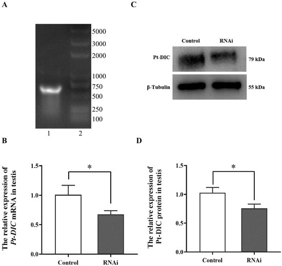 To further study the function of Pt-DIC in the spermiogenesis of P. trituberculatus, we designed a 464 bp Pt-DIC gene fragment and prepared Pt-DIC dsRNA with this fragment as a template through a TranscriptAid T7 high-yield transcription kit. The dsRNA bands were consistent with the expected size determined by gel electrophoresis (Figure 7A).