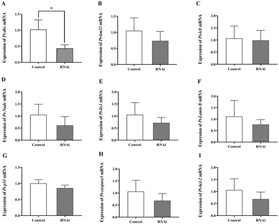 Detection of related genes after Pt-DIC in vivo interference. (A–I) represent the expression levels of Pt-dhc, Pt-km23, Pt-lc8, Pt-Nude, Pt-Lis1, Pt-Lamin B, Pt-p53, Pt-caspase3, and Pt-bcl2 mRNA in the testes of P. trituberculatus after in vivo interference with Pt-DIC. ‘*’ indicates p < 0.05.