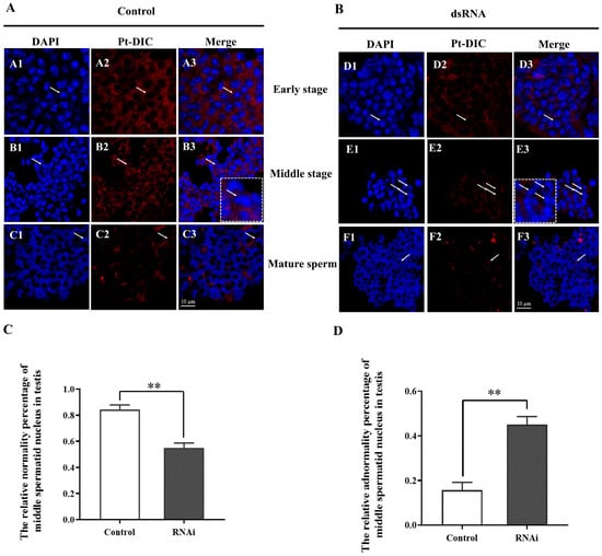 Changes in the distribution of Pt-DIC expression during spermatogenesis after in vivo interference with Pt-DIC. After interfering with Pt-DIC in vivo, the Pt-DIC signal decreased, and the nuclear morphology of spermatids in the middle stage was significantly abnormal. The blue signal represents the nucleus, the red signal represents Pt-DIC, and the white arrow points to the spermatids at different stages. The white dotted boxes represent enlarged images of spermatids pointed by white arrows. The white arrows in the dotted white box represent enlarged spermatids. (A) PBS control group, A1–A3: early spermatids; B1–B3: middle spermatids; C1–C3: mature sperm. (B) Injection of ds-DIC-RNA experimental group, D1–D3: early spermatids; E1–E3: middle spermatids; F1–F3: mature sperm. Scales = 10 μm. (C) The normal percentage of spermatid nuclei in the middle stage before and after in vivo interference with Pt-DIC; ‘**’ indicates p < 0.01. (D) The abnormal percentage of spermatid nuclei in the middle stage before and after in vivo interference with Pt-DIC; ‘**’ indicates p < 0.01.