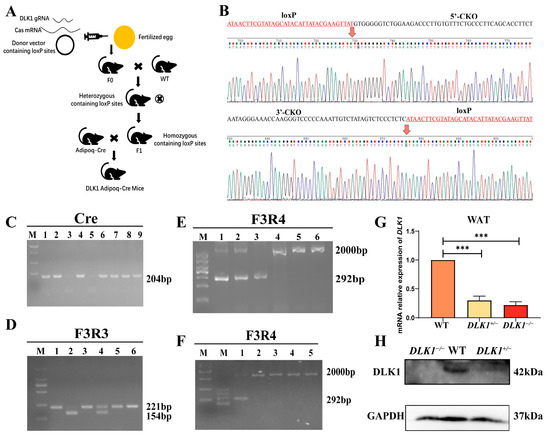 The identification result of DLK1−/− mice. (A) Preparation flow chart of DLK1 adipose tissue-specific knockout mice. (B) Sanger sequencing results of PCR-amplified fragments from DLK1 loxP locus knockout mice. (C) Gel electrophoresis results of Cre PCR products. (D) Gel electrophoresis results of PCR products for loxP site from tail-tip tissue DNA. (E) Gel electrophoresis results of PCR products of F3R4 from WAT. (F) Gel electrophoresis results of PCR products of F3R4 from WAT, hearts, livers, spleens, lungs, and kidneys. (G) Expression level of DLK1 in WAT, *** p < 0.001. (H) Western blot results of DLK1 in WAT.