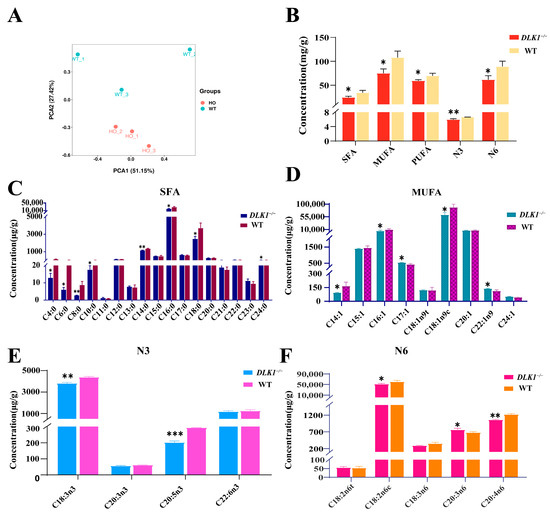 Fatty acids composition in the WAT of mice and wild-type mice. (A) PCA clustering results. (B) Total intracellular content of various fatty acids in WAT. (C) Saturated fatty acids at high levels in WAT. (D) Monounsaturated fatty acid with high levels in WAT. (E,F) Higher levels of polyunsaturated fatty acids (N:3, N:6) in WAT of different genotypes.* p < 0.05, ** p < 0.01, *** p < 0.001.
