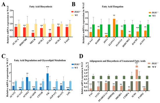 Relative expression of genes associated with lipid metabolism in WAT. (A) Differentially expressed genes related to fatty acid biosynthesis in WAT of DLK1−/− Mice. (B) Differentially expressed genes related to fatty acid elongation in WAT of DLK1−/− Mice. (C) Differentially expressed genes related to fatty acid degradation and glycerolipid metabolism in WAT of DLK1−/− Mice. (D) Differentially expressed genes related to thermogenesis, adipogenesis and biosynthesis of unsaturated fatty acids in WAT of DLK1−/− Mice. ** p < 0.01, *** p < 0.001.