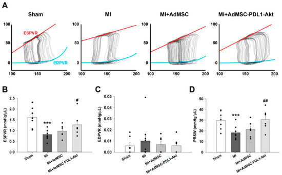 AdMSC-PDL1-Akt ameliorates MI-induced systolic dysfunction in rat hearts following left anterior descending artery (LAD) ligation. (A) Representative pressure–volume (P–V) loops across varied preloads for sham, MI, MI+AdMSC, and MI+AdMSC-PDL1-Akt rat models. (B) Comparative analysis of the average slopes of the end-systolic pressure–volume relationship (ESPVR). (C) Comparison of the average slopes of the end-diastolic pressure–volume relationship (EDPVR) across the four rat models. (D) The preload recruitable stroke work (PRSW) is also juxtaposed among the four groups. All data are presented as mean ± SEM. For quantitative analysis, the sample size was n = 6 for each group, and each black dot indicates individual sample. *** p < 0.01 in comparison to sham rats; # p < 0.05, ## p < 0.02 when compared to MI rats.