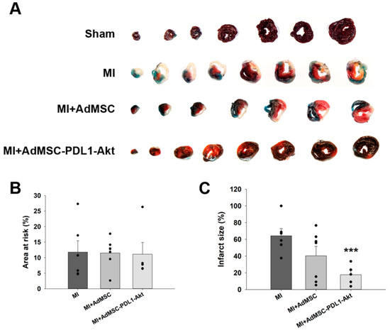 In addition to evaluating cardiac function, we assessed the potential of AdMSC-PDL1-Akt to mitigate MI-induced cardiac tissue damage. Infarct size and the area at risk (AAR) were delineated in four distinct animal groups using 2,3,5-triphenyltetrazolium chloride (TTC; red) and phthalocyanine blue staining (blue), as illustrated in Figure 4A. Comparative analysis of the AAR across the three groups revealed no statistically significant differences, suggesting uniformity in the ischemic extents across all cohorts (Figure 4B). Relative to the MI-only group, which displayed an infarct size of 64.24 ± 8.49%, the MI+AdMSC cohort showed a modest reduction with an infarct size of 40.37 ± 11.12%. Notably, the MI+AdMSC-PDL1-Akt group demonstrated a substantially diminished infarct size, recorded at 17.65 ± 5.30% (Figure 4C).