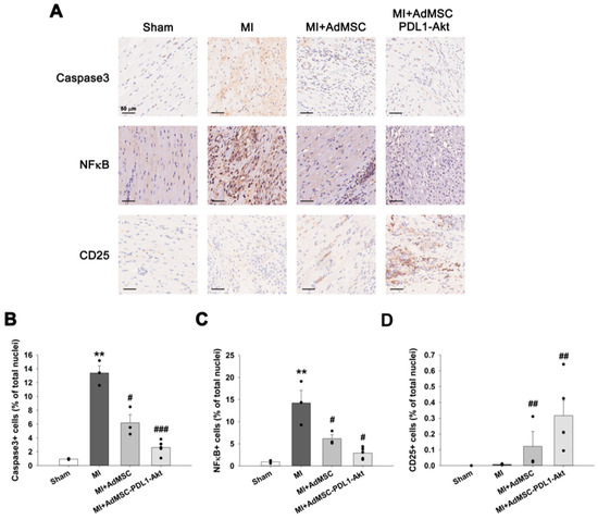 AdMSC-PDL1-Akt downregulates caspase3 and NFκB expression and upregulates CD25+ T cell expression. (A) Immunohistochemical analysis illustrating the prevalence of caspase3, NFκB, and CD25+ T cells in myocardial cross-sections from sham, MI, MI+AdMSC, and MI+AdMSC-PDL1-Akt rats. (B) Quantitative assessment of the proportion of cells demonstrating positive staining for caspase3. (C) Quantitative assessment of the proportion of cells demonstrating positive staining for NFκB. (D) Quantification of cells exhibiting positive CD25 expression. All data are presented as mean ± SEM. ** p < 0.02 when compared to sham; # p < 0.05, ## p < 0.02, ### p < 0.01 in comparison to MI rats.