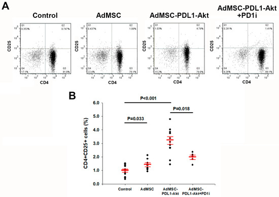 Adult C57BL/6 mice were acquired from the National Laboratory Animal Center, Taiwan. CD4+ T cells were isolated from splenic homogenates of these mice utilizing a negative-selection protocol with the BD iMag Mouse CD4 T Lymphocytes Enrichment Set (BD Biosciences, Franklin Lakes, NJ, USA). Post-isolation purity of CD4+ T cells exceeded 93%, as verified via flow cytometry. Following isolation, the CD4+ T cells concentration was adjusted to 5 × 105 cells/mL/well. These isolated lymphocytes were subsequently co-cultured with either unmodified AdMSC or AdMSC engineered to overexpress PD-L1 and Akt (AdMSC-PDL1-Akt), at a density of 4 × 104 cells/well. The co-culture was maintained in 12-well transwell tissue culture plates with culture medium for AdMSCs described previously for a period of five days. Proportions of CD4+CD25+ T lymphocytes were quantitatively assessed both prior to and following the co-culture period with AdMSC and AdMSC-PDL1-Akt.