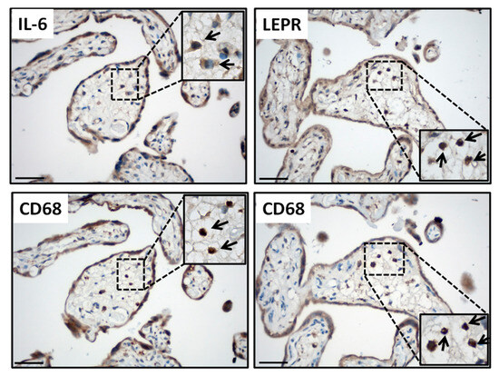 Hofbauer cells display strong IL-6 and leptin receptor expression in placenta. Representative IL-6 and leptin receptor (LEPR) immunoreactivity (upper panels) in Hofbauer cells that are immunostained with CD68 (macrophage marker) in serial sections of control placentas (lower panels). Arrows indicate IL-6 or LEPR-expressing CD68-positive Hofbauer cells. Scale bar = 30 µm. Insets represent the higher magnification of relevant areas.