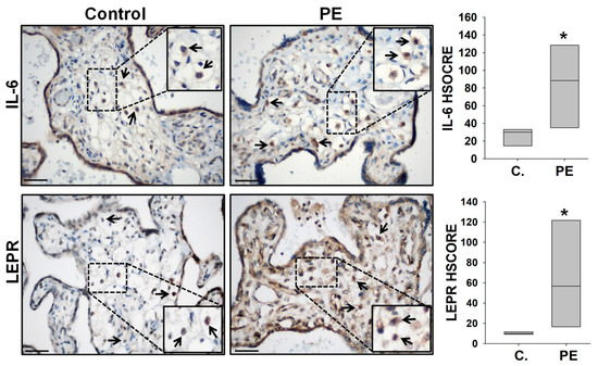 IL-6 and LEPR immunostaining in control and preeclamptic placentas. Representative images of IL-6 and LEPR immunostaining in preeclamptic (PE) and gestational aged-matched control placentas. Hofbauer cells-specific HSCORE analysis demonstrated significantly higher IL-6 (n = 5/group) and LEPR expression in PE placentas (n = 8) vs. gestational aged-matched controls (n = 7) (83.0 ± 20.9 vs. 25.0 ± 4.5 and 63.5 ± 18.6 vs. 10.9 ± 1.0, respectively). Arrows indicate IL-6 and LEPR-expressing Hofbauer cells. Bars represent median values, * p < 0.05 vs. control (C) specimens analyzed by Mann–Whitney Rank Sum test. Scale bar = 30 µm.