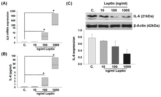 Leptin-induced IL-6 levels in primary cultured Hofbauer cells. (A) IL-6 mRNA levels in Hofbauer cells after 6 h r-leptin treatment (10, 100, and 1000 ng/mL) by qPCR. Data represent fold change as median values; * p < 0.05 vs. control (C) vehicle-treated group (n = 3) analyzed by Kruskal–Wallis One Way ANOVA on Ranks followed by Student–Newman–Keuls multiple comparison. (B) Leptin-induced secreted IL-6 levels (n = 4 from 3 different patients) in conditioned media supernatant obtained from Hofbauer cell culture after 24 h r-leptin treatment (10, 100, and 1000 ng/mL) by ELISA. Bars represent median values; * p < 0.05 vs. control (C) vehicle-treated group analyzed by Mann–Whitney Rank Sum test. (C) Immunoblot analysis of Hofbauer cell lysates after 24 h displaying reduced IL-6 expression in 100 and 1000 ng/mL leptin-treated cells. Bars represent mean ± SEM values from IL-6 protein levels after being normalized to β-actin, analyzed by Kruskal–Wallis One Way Analysis of Variance on Ranks, followed by the Student–Newman–Keuls multiple comparison method.