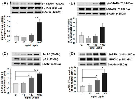 Previous studies showed that leptin binding to LEPRs activates several intracellular signaling pathways, i.e., JAK/STAT, NF-κB, and ERK1/2 MAPK in a variety of cell types [46]. Therefore, to identify relevant pathways responsible for leptin-induced IL-6 expression, HBCs were treated with either control or 10, 100, 1000 ng/mL r-leptin and then subjected to immunoblotting to evaluate both the total (t-) and activated (phosphorylated; ph-) forms of STAT3, STAT5, p65 NF-κB, and ERK1/2 MAPK signaling molecules. Immunoblotting results revealed that: (1) compared to the control, only 1000 ng/mL leptin treatment significantly increased the phosphorylation of STAT5 (p = 0.01, Figure 4A), whereas increased STAT3 phosphorylation did not attain significance (Figure 4B); and (2) the phosphorylation of both p65 NF-κB (p < 0.05, Figure 4C) and ERK1/2 (p < 0.05, Figure 4D) was significantly increased in both 100 and 1000 ng/mL r-leptin-treated HBCs, whereas total forms of the relevant molecules were not altered by any leptin concentration.
