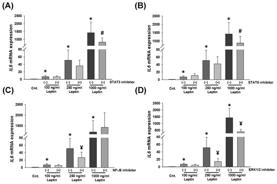 Leptin-induced IL-6 mRNA expression in Hofbauer cells is primarily mediated by ERK1/2 signaling pathway. IL-6 mRNA levels in Hofbauer cells treated with 100, 250, and 1000 ng/mL r-leptin ± specific inhibitors for STAT3 (A), STAT5 (B), p65 NF-κB (C), and ERK1/2 (D) signaling pathways. Bars represent mean ± SEM, n = 3, * p < 0.05 vs. control (Cnt), analyzed by Kruskal–Wallis One Way Analysis of Variance on Ranks followed by Student–Newman–Keuls multiple comparison method, # p < 0.05 leptin with inhibitor vs. without inhibitor (A,B), ¥ p ≤ 0.001 leptin with inhibitor vs. without inhibitor (C,D) analyzed by t-test.