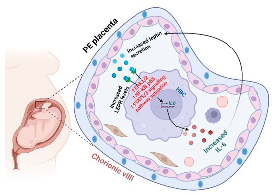Our immunostaining results confirmed the widespread expression of LEPR in syncytiotrophoblasts, cytotrophoblasts, villous vessels, and HBCs, as previously demonstrated [50,51]. For the first time, we revealed enhanced LEPR levels in HBCs from PE vs. control placentas. This is in contrast to Li et al. [50], who reported no significant difference in LEPR levels in whole placental specimens obtained from PE vs. control placentas and LEPR immunoreactivity was detected in syncytiotrophoblasts, cytotrophoblasts, villous endothelial cells, Hofbauer cells, and endometrial decidual cells. This contradiction could be explained by primarily focusing on HBC-specific LEPR expressions between groups. Furthermore, we also showed significantly higher IL-6 immunoreactivity in HBCs of the PE vs. GA-matched control placentas. This finding complements our previous study that demonstrated enhanced IL-6 levels in both decidual cells and interstitial cytotrophoblasts at the maternal-fetal interface from PE placentas vs. the control [52]. Previous studies also demonstrated higher IL-6 immunoreactivity in syncytiotrophoblasts, endothelial cells, and macrophages of preeclamptic placenta vs. the control [53,54,55]. Overall, HSCORE results revealed the co-localization of IL-6 and LEPR in HBCs and their enhanced levels in PE placentas, suggesting a local pro-inflammatory action of leptin in HBCs. These findings also suggest the existence of a potential, previously undisclosed paracrine interaction in which trophoblasts generated leptin by binding to LEPR expressed in HBCs, which induces IL-6 expression, and then targeted neighboring trophoblasts to further promote inflammation in PE (Figure 6).