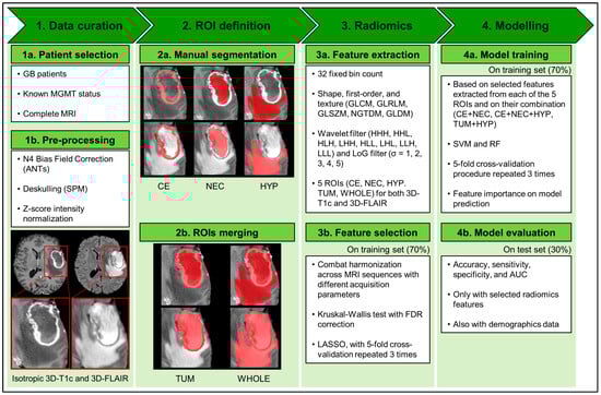 - Li, Z.-C.; Bai, H.; Sun, Q.; Li, Q.; Liu, L.; Zou, Y.; Chen, Y.; Liang, C.; Zheng, H. Multiregional radiomics features from multiparametric MRI for prediction of MGMT methylation status in glioblastoma multiforme: A multicentre study. Eur. Radiol. 2018, 28, 3640–3650. [Google Scholar] [CrossRef]