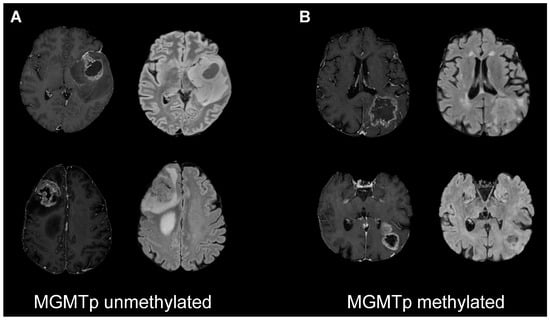 - Hegi, M.E.; Diserens, A.-C.; Gorlia, T.; Hamou, M.-F.; de Tribolet, N.; Weller, M.; Kros, J.M.; Hainfellner, J.A.; Mason, W.; Mariani, L.; et al. MGMT Gene Silencing and Benefit from Temozolomide in Glioblastoma. N. Engl. J. Med. 2005, 352, 997–1003. [Google Scholar] [CrossRef] [PubMed]