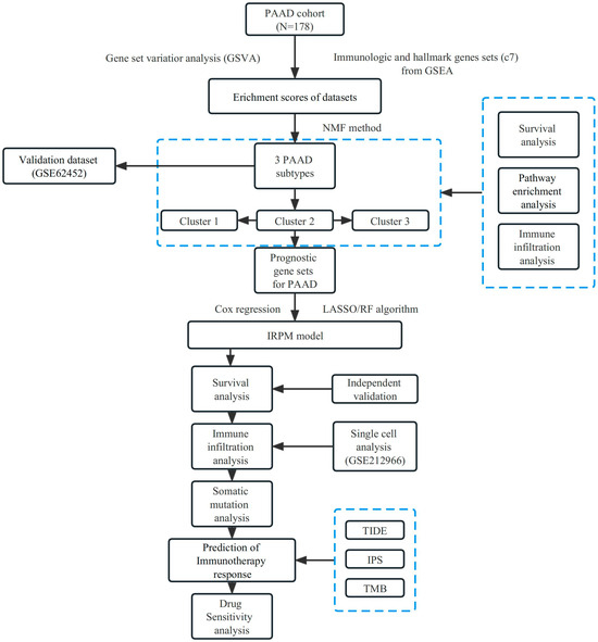 A flow chart of the study design is presented in Figure 1. We first collected the TCGA-PAAD dataset and C7 immunologic and hallmark gene sets from TCGA and GSEA databases, respectively. Then, GSVA analysis was used to evaluate the variation of the immunologic signature gene sets (C7) in PAAD patients. Table S1 shows enrichment scores in PAAD and adjacent normal tissues.