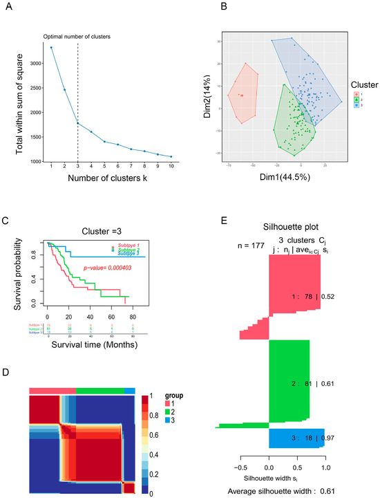Identification of PAAD subtypes. (A) K = 3 was the optimal suggested value of number of clusters. (B) Visualization of the cluster results for PAAD samples. (C) Survival analysis for PAAD patients among clusters. (D) Consensus map of NMF clustering. (E) Silhouette plot for the PAAD clusters.