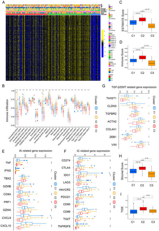 Immune landscape in PAAD patients among three clusters. (A) Heatmap demonstrating the clinicopathologic features among three clusters. (B) The infiltration levels of 22 immune cells in the three clusters. (C,D) The ESTIMATE score (C) and Immunoscore (D) in clusters 1, 2, and 3. (E–G) The expression levels of immune activation (E), immune checkpoint related genes (F), and TGF-β/EMT signaling pathway-related genes (G) in the three clusters. (H,I) Differences in stromal score (H) and TIDE scores (I) in clusters 1, 2, and 3. * p < 0.05, ** p < 0.01, and *** p < 0.001.