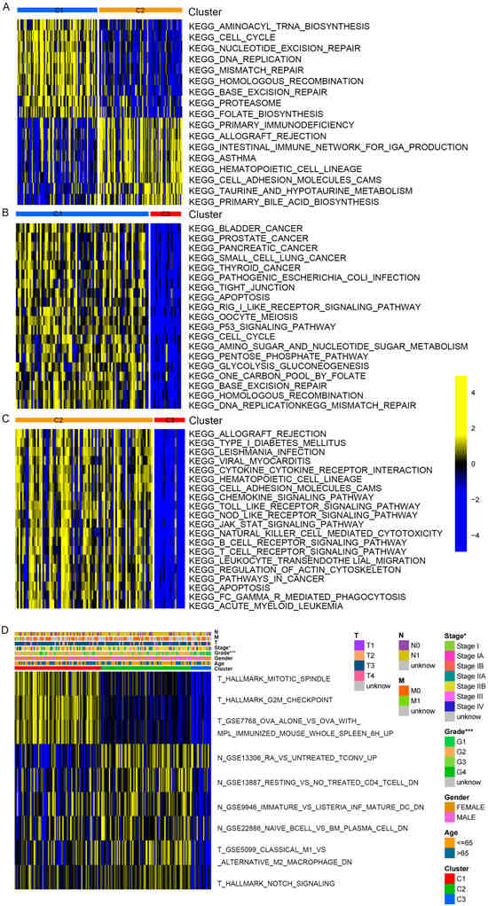 Enrichment score difference of distinct PAAD clusters. (A–C) KEGG enrichment analysis showing the activation states of signaling pathway in distinct PAAD clusters. (A) Cluster 1 vs. cluster 2; (B) cluster 1 vs. cluster 3; (C) cluster 2 vs. cluster 3. (D) Heatmap shows the differential enrichment score of gene sets among 3 clusters. * p < 0.05, and *** p < 0.001.