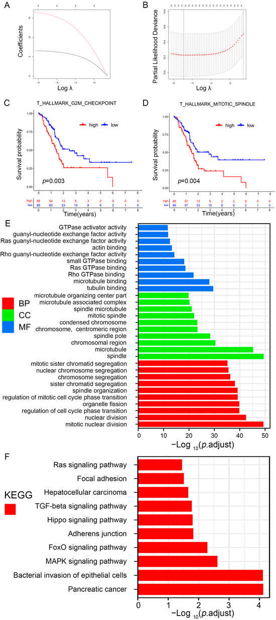 Identification of prognosis-related gene sets in PAAD. (A) LASSO coefficient (y-axis) of gene sets and the optimal penalization coefficient (λ) via 10-fold cross-validation based on partial likelihood deviance. (B) The dotted vertical lines represent the optimal values of λ. The top x-axis has the numbers of gene sets, whereas the lower x-axis revealed the log (λ). (C,D) Survival analysis for PAAD patients based on high or low enrichment scores. (E,F) Visualization for the results of GO (E) and KEGG pathway analyses (F).