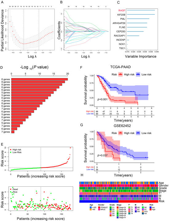 Construction of prognostic model based on prognosis-related genes in PAAD. (A,B) LASSO coefficient of prognosis-related genes in PAAD. (C) Random survival forest analysis screening of 10 genes. (D) The top 20 signatures were arranged by the p value of KM following Kaplan-Meier analysis of 210-1 = 1023 combinations. As a result of the signature’s relatively high log10 p-value and limited number of genes, six genes were filtered out. (E) The risk scores plot and overall survival status of prognostic model. (F,G) Survival analysis for PAAD patients based on high- or low-risk scores in TCGA cohort (F) and external validation dataset (GSE62452) (G). (H) Heatmap depicting the clinicopathologic features between high- and low-risk groups. * p < 0.05.