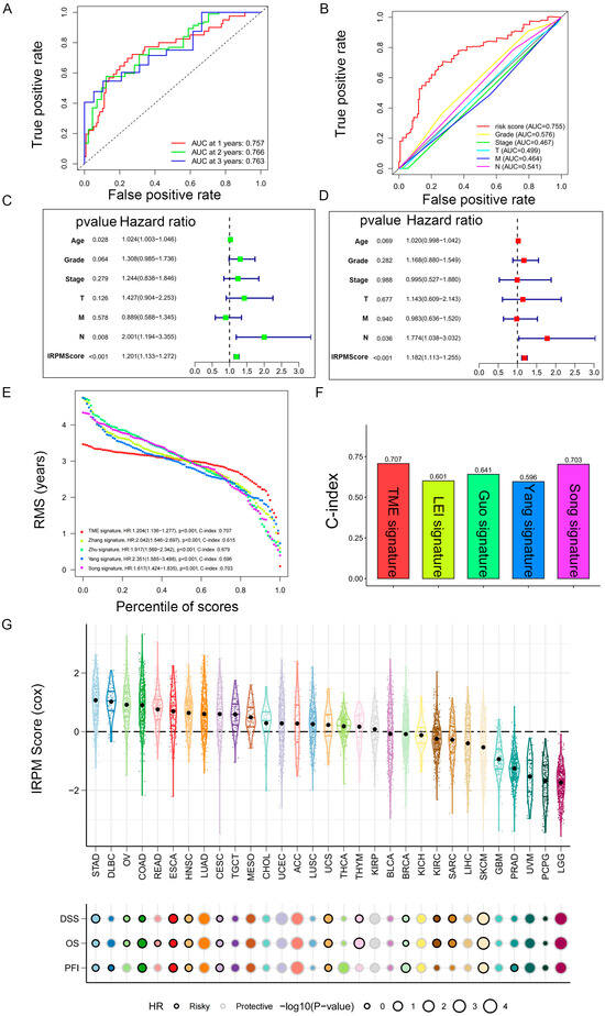 Prediction performance and independence evaluation of IRPM model. (A) ROC curve for 1-year, 2-year, and 3-year overall survival. (B) ROC curve of IRPM model and other clinicopathological features. (C,D) Validation of the independence of the risk model in the overall survival through univariate (C) and multivariate (D) Cox regression analyses. (E,F) RMS curves (E) and C-index (F) of IRPM and other previously developed PAAD signatures. (G) Prognostic performance of the IRPM model in pan-cancer in TCGA cohort.