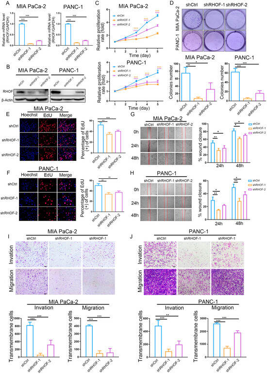 In light of the accuracy of the IRPM score in the prognostic assessment of PC patients and the significance of the RHOF gene in prognostic models, we conducted a series of in vitro experiments to investigate its role in the occurrence and progression of pancreatic cancer. The lentiviral packaging of shRHOF was employed to infect pancreatic cancer cell lines, resulting in a successful decrease in RHOF expression at both the RNA and protein levels (Figure 8A,B). Subsequently, the growth rate and clone formation ability of MIA and PANC-1 cells were significantly reduced upon decreased RHOF expression, as evidenced by MTT and plate clone formation assays (Figure 8C,D). Moreover, the utilization of the EdU assay confirmed a noticeable deceleration in the growth of pancreatic cancer cells due to decreased RHOF expression (Figure 8E,F). To investigate the influence of RHOF on invasion and metastasis in pancreatic cancer cells, alterations in the invasion and migration capabilities of these cells were examined in stable cell lines with RHOF knockdown. Scratch assays revealed a substantial inhibition of cell migration in MIA and PANC-1 cells upon the knockdown of RHOF (Figure 8G,H), which was further validated by transwell assays, indicating a significant decrease in the invasion and migration capacities of these cells (Figure 8I,J).