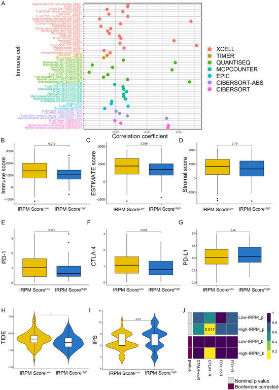 To explore the correlation between immune cell infiltration and IRPM risk scores, we first conducted Spearman’s correlation analysis based on the EPIC, QUANTISEQ, XCELL, CIBERSORT-ABS, MCPcounter, TIMER, and CIBERSORT algorithms. The results of the correlation analysis were visualized using a lollipop plot, which showed that the IRPM risk score was inversely correlated with the infiltration of multiple anti-cancer active ingredients, including CD4+T cells, B cells, NK cells, CD8+T cells, and DCs (Figure 9A). We also found that the infiltration level of CD8+T cells, B cells, and NK cells decreased in the IRPM high-risk group (Figure S4A–C). Notably, we discovered that the stromal and microenvironment scores were inversely correlated with IRPM scores (Figure S4D,E). Moreover, using the ESTIMATE algorithm, we also obtained the same results that the IRPM risk score inversely correlated with immune, estimate, and stromal scores (Figure 9B–D, p < 0.01), indicating that a higher risk of IRPM is associated with less intratumorally infiltrated stromal cells. Differential analysis was subsequently conducted to investigate the association between IRPM and immune checkpoints. PD-1 and CTLA-4 expressions were found to be higher in the IRPM low-risk group than in the IRPM high-risk group (Figure 9E,F), whereas no significant difference was observed for PD-L1 (Figure 9G).