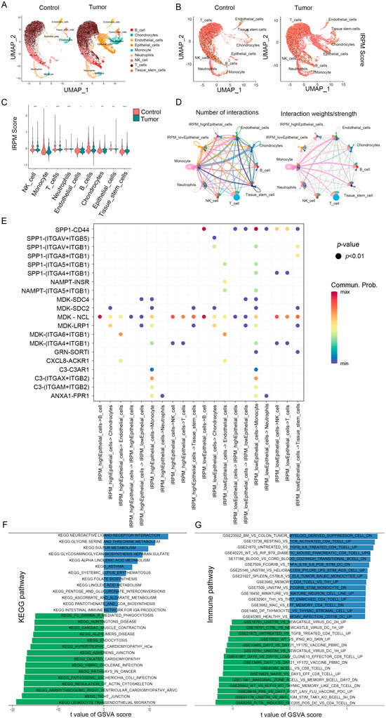 IRPM score heterogeneity and associated immune characteristics in tumor microenvironments. (A,B) The UMAP visualization shows nine main cell types in a single-cell pancreatic cancer data (GSE2129664), colored by cell type (A) and the IRPM scores (B). (C) Violin plot for the IRPM scores in different cell subtypes. (D) Circle plots depicting the interaction numbers and interaction strength between high-IRPM epithelial cells, low-IRPM epithelial cells, and other cell subtypes, respectively. (E) Dot plot illustrating substantial ligand-receptor interactions between high-IRPM/low-IRPM epithelial cells and surrounding cells. The CellChat program used colors to represent the communication possibility. The permutation p-value is shown by point size. (F,G) KEGG (F) and immune-related (G) pathways enrichment analysis of DEGs in high- and low-IRPM score groups. ** p < 0.01, and *** p < 0.001.
