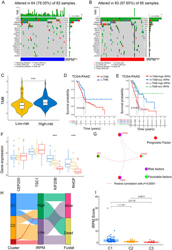 Comparison of somatic mutation landscape in PAAD patients with different IRPM risk scores. (A,B) The mutation landscape between low- and high-IRPM PAAD samples. (C) Differences in TMB between low- and high-IRPM groups. (D) Survival analysis for high-TMB and low-TMB groups of the PAAD patients. (E) Survival analysis for PAAD patients stratified by both IRPM scores and TMB. (F) The expression of 4 immune-related prognostic genes in three gene cluster. (G) The interaction between 4 immune-related prognostic genes in PAAD; the size of the circle represents the effect of each gene on the prognosis; purple dots in the circle represent risk factors of prognosis, and green dots represent protective factors of prognosis; the lines linking genes show their interactions; pink represents positive correlation. (H) The alluvial diagram of three clusters in groups with different IRPM risk scores and survival status. (I) The IRPM scores varied among three clusters. *** p < 0.001.