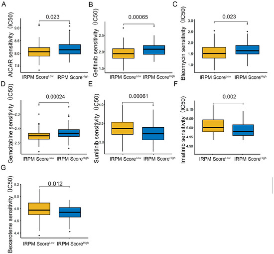 Compared antitumor drug sensitivity in PAAD patients with low- and high-IRPM score groups. (A) AICAR, (B) Gefitinib, (C) Bleomycin, (D) Gemcitabine, (E) Sunitinib, (F) Imatinib, (G) and Bexarotene.