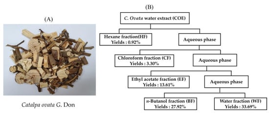 Catalpa ovata G. Don (A) and the scheme of the fractionation of the C. ovata water extract (COE) using organic solvent partitioning (B).