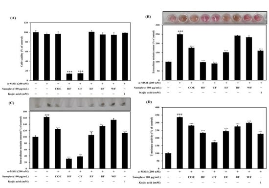 The effect of the COE and its fractions on B16F1 cell viability was determined using an MTT assay. B16F1 melanoma cells were incubated with the COE and its fractions (at 100 μg/mL) with α-MSH (200 nM) for 72 h, and cell viability was tested. As shown in Figure 2A, the cell viability in the treatments with COE and its fractions was over 95%, and there was no significant effect compared to the non-treated cells. However, the cell viability of the hexane and chloroform fractions was significantly reduced to under 20%. Next, we investigated the effect of the COE and its fractions on α-MSH-stimulated melanogenesis, the quantity of intracellular melanin, the quantity of extracellular melanin, and tyrosinase activity. As shown in Figure 2B,C, the extra-/intracellular melanin contents were decreased via the treatment with the COE and its fractions (extracellular melanin content: control, 100.00 ± 0.57%; α-MSH, 249.14 ± 7.91%; COE, 175.61 ± 2.93%; hexane fraction (HF), 97.52 ± 0.65%; chloroform fraction (CF), 90.66 ± 0.32%; ethyl acetate fraction (EF), 151.23 ± 1.74%; n-butanol fraction (BF), 242.09 ± 1.31%; water fraction (WF), 233.33 ± 2.37%; kojic acid, 160.00 ± 1.97%; intracellular melanin content: control, 100.00 ± 4.06%; α-MSH, 162.66 ± 1.88%; COE, 124.46 ± 2.47%; HF, 30.94 ± 1.86%; CF, 38.29 ± 1.61%; EF, 105.89 ± 8.62%; BF, 134.33 ± 1.81%; WF, 153.57 ± 1.78%; kojic acid, 112.18 ± 1.46%). It can, thus, be confirmed that the COE and all of its fractions had inhibitory effects on melanin synthesis. The extracellular/intracellular melanin content was very low in the treatments with HF and CF. However, it seems that the melanin content was low due to the cytotoxicity of HF and CF. We found that EF significantly reduced the extra-/intracellular melanin content without cell toxicity. Our results indicated that EF suppressed the intracellular melanin content in a similar manner to that of the positive control (kojic acid, 1 mM).