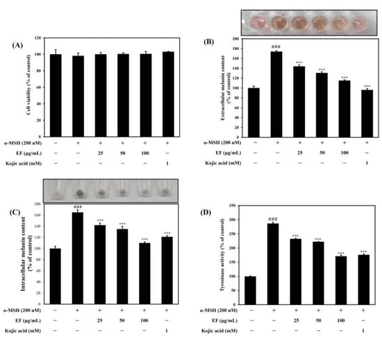 The cellular tyrosinase activity was monitored as described previously with slight modifications [45]. Briefly, B16F1 cells were treated with EF for 72 h, and the tyrosinase activity was estimated by measuring the rate of the formation of dopachrome from L-DOPA as a substrate for tyrosinase. The cells were lysed via incubation at 37 °C for 15 min in lysis buffer and centrifuged at 13,000 rpm for 3 min to obtain the supernatant. The reaction mixture contained 0.1 M sodium phosphate (pH 7.4), L-DOPA (2 mg/mL), and a supernatant. After incubation at 37 °C for 1 h, the dopachrome was monitored by measuring the absorbance at 405 nm using microplate reader. The value of each measurement is expressed as a percentage change in the control.