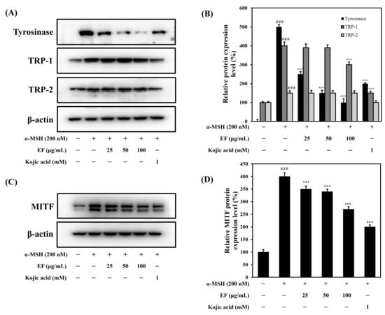 Inhibitory effect of EF on the expression of melanogenesis-related proteins in B16F1 cells. Cells were treated with various concentrations of EF, kojic acid, and α-MSH (200 nM) for 72 h (A,B) or 4 h (C,D). The results are expressed as the mean ± SD from three independent experiments. ### p < 0.001 compared with the control group; *** p < 0.001 compared with the α-MSH-stimulated group.