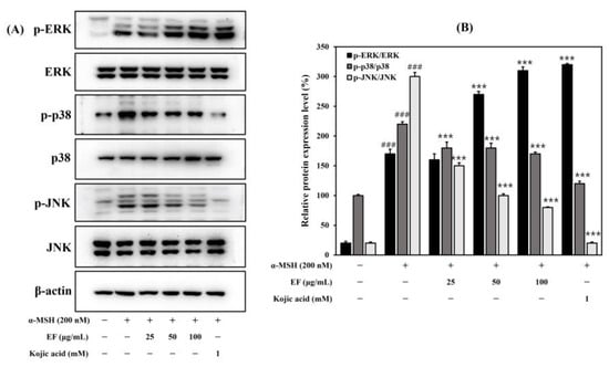 Inhibitory effect of EF on the expression of MAPKs (A,B) in B16F1 cells. Cells were treated with various concentrations of EF, kojic acid, and α-MSH (200 nM) for 30 min. The results are expressed as the mean ± SD from three independent experiments. ### p < 0.001 compared with the control group; *** p < 0.001 compared with the α-MSH-stimulated group.
