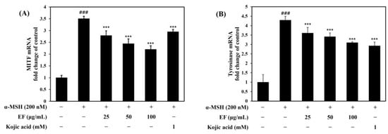Inhibitory effect of EF on the expression of MITF mRNA (A) and tyrosinase mRNA (B) in B16F1 cells. Cells were treated with various concentrations of EF (0–100 μg/mL), kojic acid (1 mM), and α-MSH (200 nM) for 2 h (A) or 24 h (B). qRT-PCR was conducted to evaluate the MITF and tyrosinase mRNA levels. The results were normalized against the 36B4 expression. ### p < 0.001 versus control; *** p < 0.001 versus α-MSH.