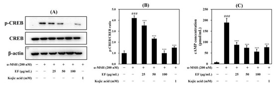 Effect of EF on p-CREB expression (A,B) and cAMP concentration (C) in stimulated B16F1 cells. Cells were treated with various concentrations of EF and kojic acid (1 mM) for 24 h and then α-MSH (200 nM) for 20 min. The results were expressed as the mean ± SD from three independent experiments. ### p < 0.001 compared with the control group; *** p < 0.001 compared with the α-MSH-stimulated group.