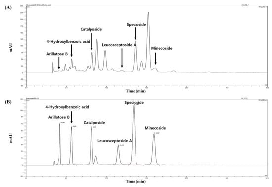 Among the several compounds predicted for EF using LC-MS/MS, six major compounds were confirmed using HPLC analysis (Figure 8A). The six major compounds were arillatose B, 4-hydroxybenzoic acid, catalposide, leucosceptoside A, specioside, and minecoside, and the peak retention times were found to be 4.20 min, 5.65 min, 8.14 min, 11.47 min, 13.40 min, and 15.92 min, respectively (Figure 8B). The contents of arillatose B, 4-hydroxylbenzoic acid, catalposide, leucosceptoside A, specioside, and minecoside in EF were 15.27 μg/mg, 19.51 μg/mg, 100.20 μg/mg, 72.32 μg/mg, 104.26 μg/mg, and 63.71 μg/mg, respectively. The EF showed high contents of catalposide, specioside, and minecoside.