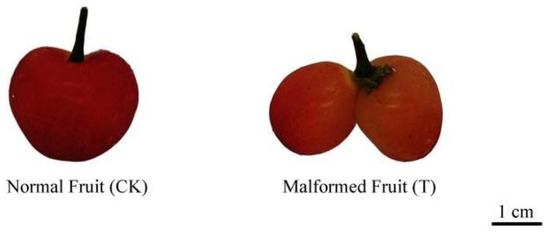 In this study, sweet cherry was selected as the experimental material, and the experimental site was located at the Tiangong Manor sweet cherry experimental base of Yinzhou district, Ningbo City, Zhejiang Province, China (E 121.58172°, N 29.80472°). Ten sweet cherry fruit trees with good growing conditions and the same developmental period were selected for testing. The entire tree was sprayed with GA3 (25 mg/L) meticulously in the early flowering period and 10 days after full bloom. A control group of normal fruit (CK) and a test group of malformed fruit (T) were set up in the experiment (Figure 1 and Figure S1). After 32 days of the second GA3 treatment, 3 normal fruits and 3 malformed fruits were picked from 10 experimental sweet cherry trees, respectively. After picking, the fruits were brought back to the laboratory immediately, then frozen in liquid nitrogen, and stored in a −80 °C refrigerator for subsequent experiments. Three biological replicates were prepared for each sample.