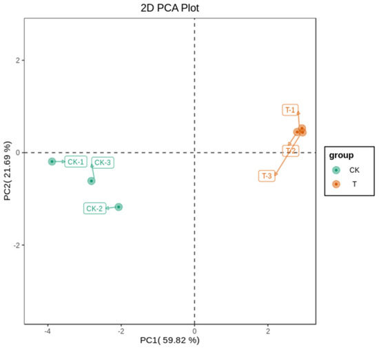 The principal component analysis (PCA) results of the metabolome profiles are shown in Figure 2. Six samples can be separated from the first two principal components, accounting for 59.82% and 21.69% of the total variation rate, respectively. In the PCA analysis chart, the two groups showed a separation trend, and each repeated cluster of the two groups showed good experimental data. The clustering results of group T were more concentrated than those of group CK, indicating that the repeatability of group T in the experiment was better than that of group CK. Significant differences existed between the two sweet cherry samples; the T group was distributed on the positive end of PC1, while the CK group was distributed on the negative end of PC1. In addition, in PC2, the T group was distributed on the positive end, and the CK group was distributed on the negative end.